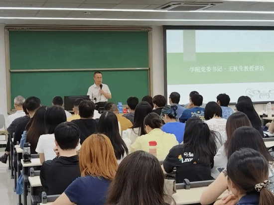 最后,英语和高级翻译学院党委王秋生书记做总结发言。王秋生书记在讲话中勉励新生尽快适应研究生学习生活,珍惜时光、刻苦钻研,努力提升专业本领和综合素养。他强调要将个人学业规划与国家发展紧密结合,树立远大志向,在未来就业选择中勇于担当时代使命,把青春奋斗融入党和人民的事业之中。