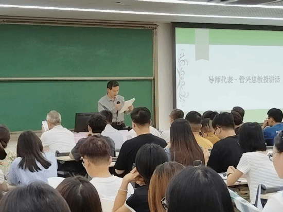 之后,管兴忠教授作为导师代表致辞,阐述了外语学科在文明互鉴与全球治理中的重要意义,并就硕博不同阶段提出培养要求,强调应注重基础、跨界与创新。他结合国家战略与人才数据,分析英高人的时代使命,鼓励新生成长为兼具家国情怀与国际视野的复合型人才。