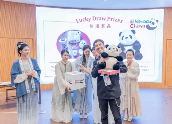 中国馆举办的“茶和天下 雅集”活动,布鲁诺抽中熊猫玩偶,现场洋溢欢乐气氛(后排左三)