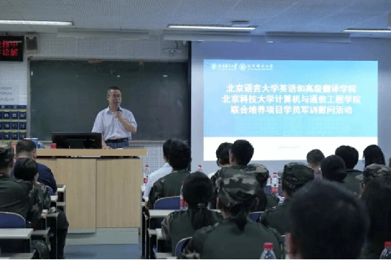 8月26日晚,北京语言大学英语和高级翻译学院与北京科技大学计算机与通信工程学院联合培养项目学员军训慰问活动在北京科技大学机电信息楼温情举行。北科计通学院副院长皇甫伟、辅导员胡秀军、张振亚与胡晗明,我院党委书记王秋生、党委副书记刘洁、副院长韩林涛、辅导员苌怡萍,以及两校联合培养项目全体学员出席活动。