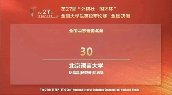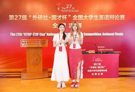 6月9日,第27届“外研社·国才杯”全国大学生英语辩论赛全国总决赛圆满落幕。本届赛事分为校级选拔赛、地区复赛与全国决赛三个阶段。3月至4月,全国共有441支队伍、近千名选手参加地区复赛,175支队伍晋级全国决赛。其中,于6月1日落幕的全国决赛中,由岳晶晶老师带领,我校23英西张柏翎与23英2李莹璐组成的队伍获得了全国银奖的荣誉,24英1杨璐菁与24英翻何思昊组成的队伍获得了全国金奖的荣誉并且顺利晋级到全国32强的总决赛比赛中。