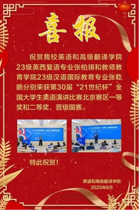 除此之外,在6月8日举行的的第30届“21世纪杯”全国大学生演讲比赛中,英辩队的23英西张柏翎同学获得了北京赛区一等奖。再次恭喜!!